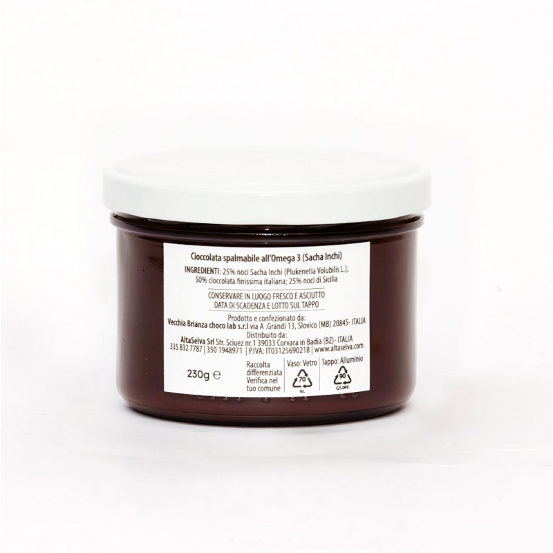 Genießen Sie unseren köstlichen Schokoladenaufstrich, angereichert mit Omega-3, hergestellt aus 25% Sacha-Inchi-Nüssen – eine wertvolle Zutat für Ihr Wohlbefinden dank der essenziellen Fettsäuren. Kombiniert mit 50% feinster italienischer Schokolade und 25% sizilianischen Haselnüssen, ist dieser Aufstrich 100% natürlich, ohne Konservierungsstoffe oder künstliche Zusätze. Ideal für ein gesundes Frühstück, einen leckeren Snack oder zur Verfeinerung Ihrer Desserts mit einer einzigartigen Note. Nachhaltig, gesund und unwiderstehlich lecker.