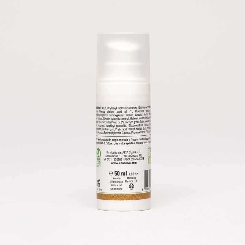 La Crema Viso Protezione Solare SPF50+ Alta Selva è formulata per offrire un’elevata protezione contro i raggi UVA e UVB, mantenendo la pelle idratata e morbida grazie agli estratti naturali di Sacha Inchi, Moringa e Cirmòlo. Ideale per l’uso quotidiano, questa crema combina un’efficace azione dermoprotettiva con ingredienti biologici e certificati vegan.