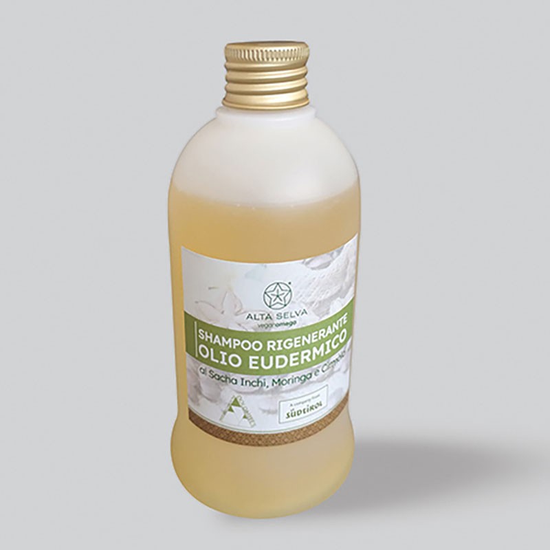 Innovativo shampoo eudermico dalla texture cremosa, formulato senza acqua, con il 12,5% di olio di Sacha Inchi, il 12,5% di olio di Moringa e olio essenziale di cirmolo.