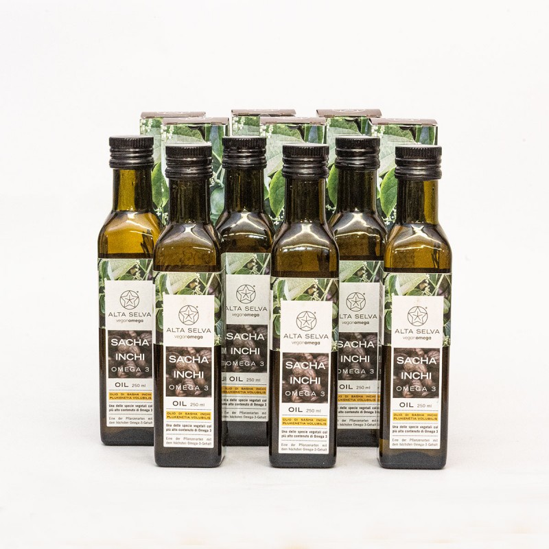 La confezione contiene 6 bottiglie da 250 ml di olio Sacha Inchi spremuto a freddo senza nessuna addizione di altre sostanze.